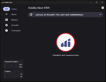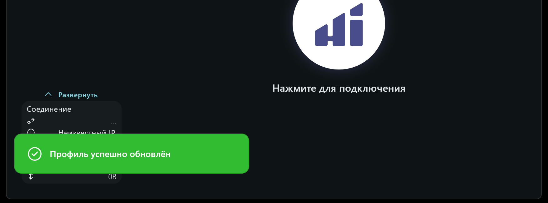 Для подключения/отключения к VPN нажать на кнопку в центре “Нажмите для подключения” / “Подключено”