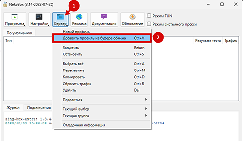 В приложении в верхей панели инструментов выбрать “Сервер” > “Добавить профиль из буфера обмена”.Если добавляется подписка, выбрать вариант вставки “Как подписку (добавить в эту группу)” или “Как подписку (создать новую группу)”.