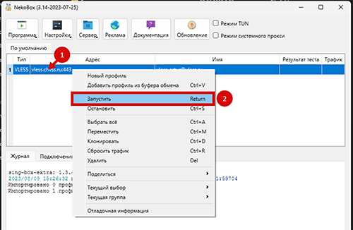 Чтобы выключить VPN, небходимо снова кликнуть правой кнопкой мыши по серверу и выбрать “Остановить”, затем отключить “Режим системного прокси”. Для того, чтобы полностью выключить приложение, необходимо в трее компьютера (в правом нижнем углу, рядом с часами) найти приложение “NekoBox”, кликнуть правой кнопкой мыши и выбрать “Выход”.