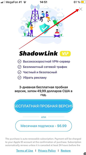 Перейти в приложение и закрыть экран с предложением о покупке платной версии (в приложении ничего оплачивать не нужно)