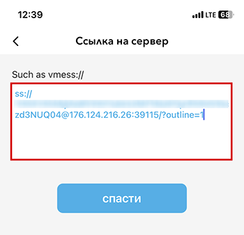 Скопировать ранее полученный ключ в поле и нажать на кнопку “спасти” (да, такой перевод приложения на русский язык) - после этого сервер добавлен