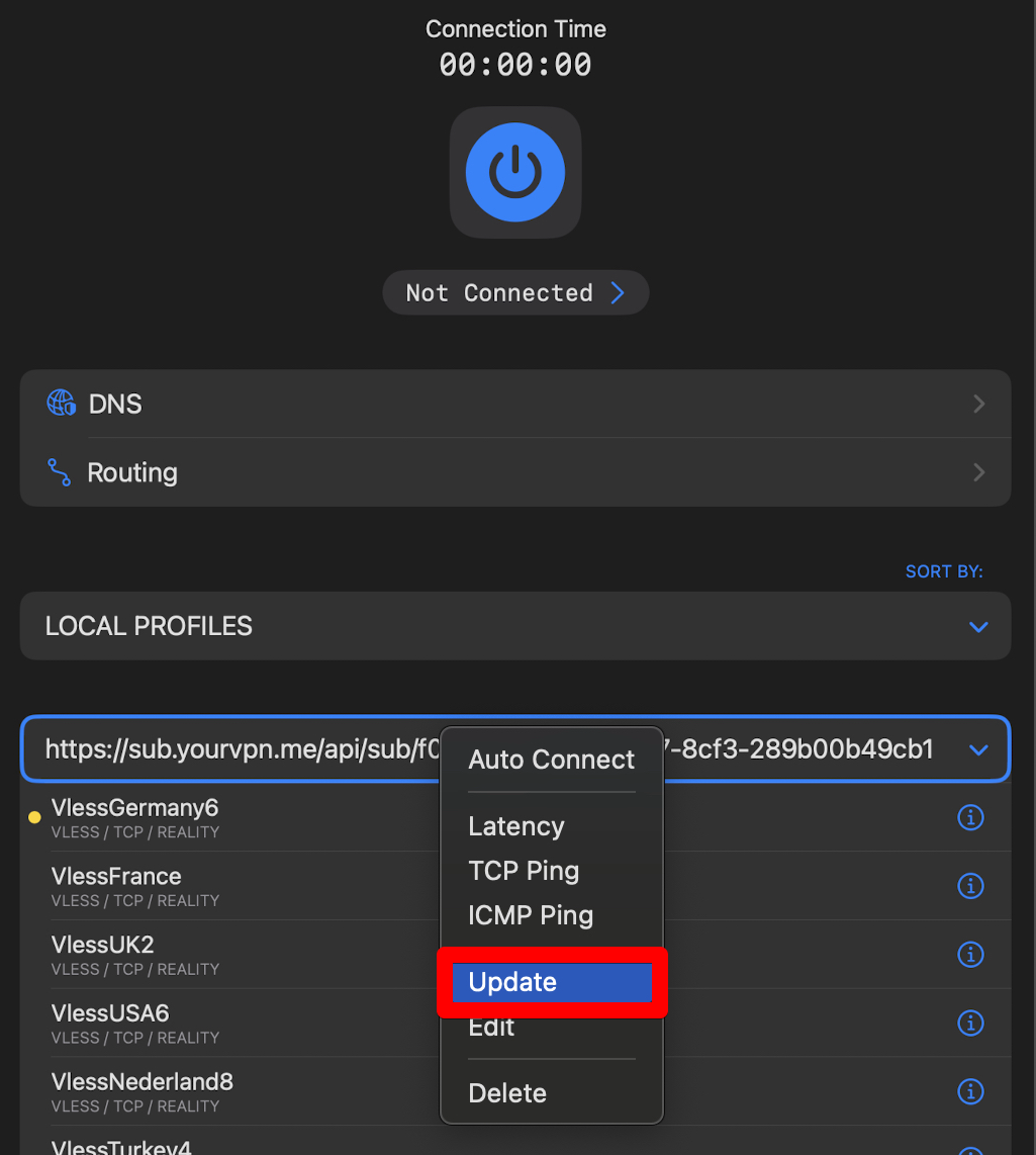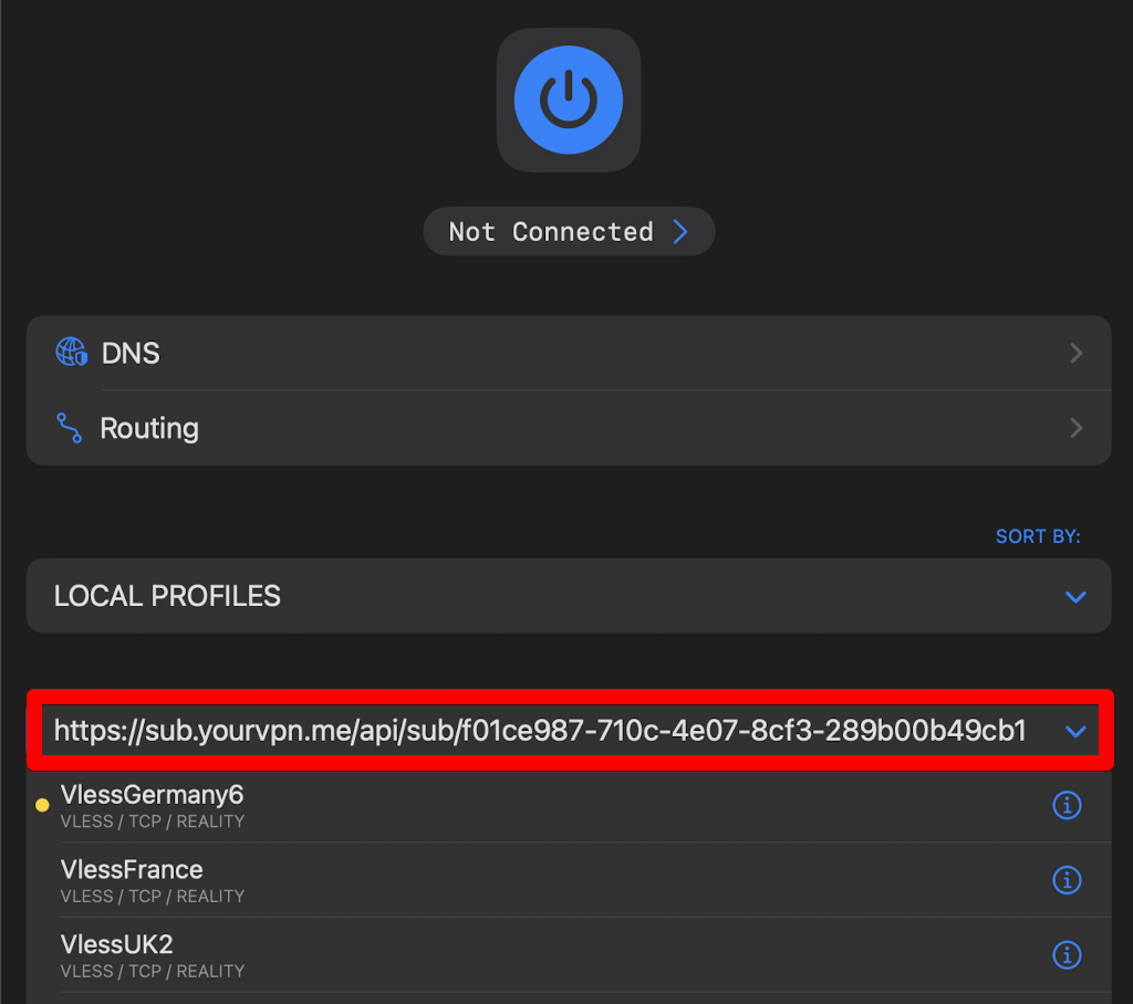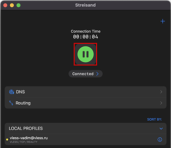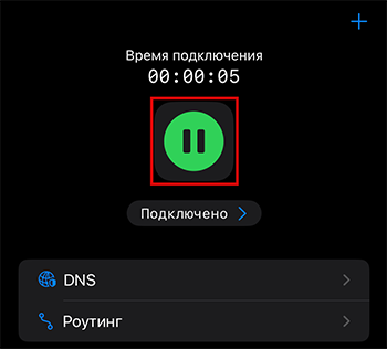 - Для подключения/отключения к VPN нажать на кнопку в центре окна