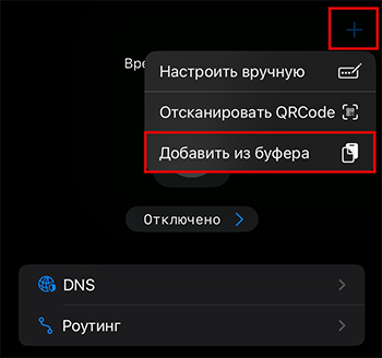 - В правом верхнем углу нажать на кнопку с плюсом и выбрать “Import from Clipboard” / “Добавить из буфера”
