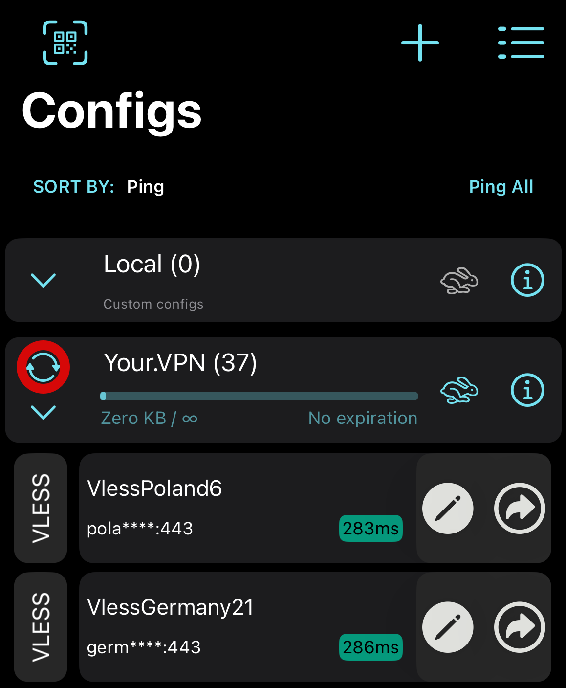 Повторить шаг со всеми подписками, которые есть То, как должно выглядеть окно приложения в конце Получить ВПН-ключ бесплатно на 3 дня можно в нашем телеграм-боте Your.VPN # Ручное обновление подписки# Выключить ВПН (если он включен) В нижнем меню перейти в раздел “Configs” Нажать на две круглые стрелки Автоматическое обновление подписки# Обратите внимание: включение данной функции может сбрасывать ранее выбранный сервер и в приложении будет появляться предупреждающая надпись: Select Config First. В этом случае нужно перейти на вкладку Configs и выбрать нужный сервер нажав на него
