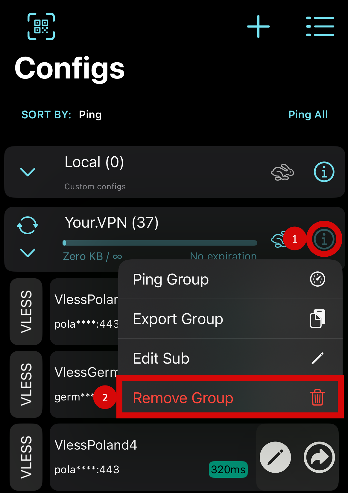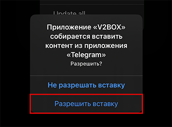 Скопировать в память устройства ссылку на подписку В нижнем меню перейти в раздел “Configs” Нажать на кнопку в виде “+” в верхнем правом углу и выбрать пункт “Add Subscribtion” Если появится сообщение с предупреждением, выбрать “Разрешить вставку” В окне добавления подписки в поле “Name” вписать любое название, в поле “URL” вставить ранее скопированную ссылку на подписку Выбрать нужный сервер нажав на него Вернуться на главный экран по кнопке “Home” в левом нижнем углу Для подключения/отключения к VPN свайпнуть по кнопке внизу экрана Получить ВПН-ключ бесплатно на 3 дня можно в нашем телеграм-боте Your.VPN # Удаление ключей и подписки# Открыть приложение “V2Box” Выключить ВПН (если он включен) В нижнем меню перейти в раздел “Configs” В разделе “Local” нажать на ( i ), выбрать пункт “Remove Local Configs” В разделе с подписками нажать на ( i ), выбрать пункт “Remove Group”