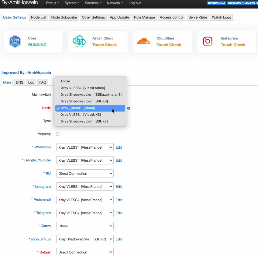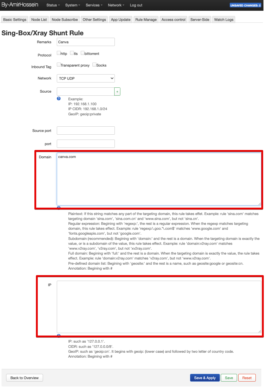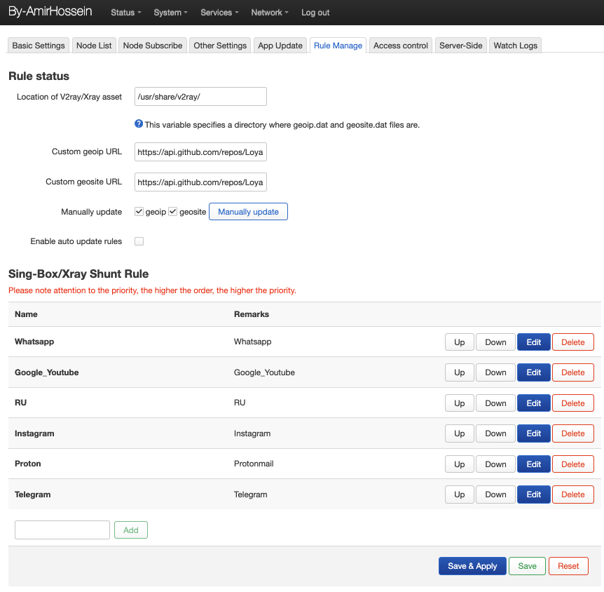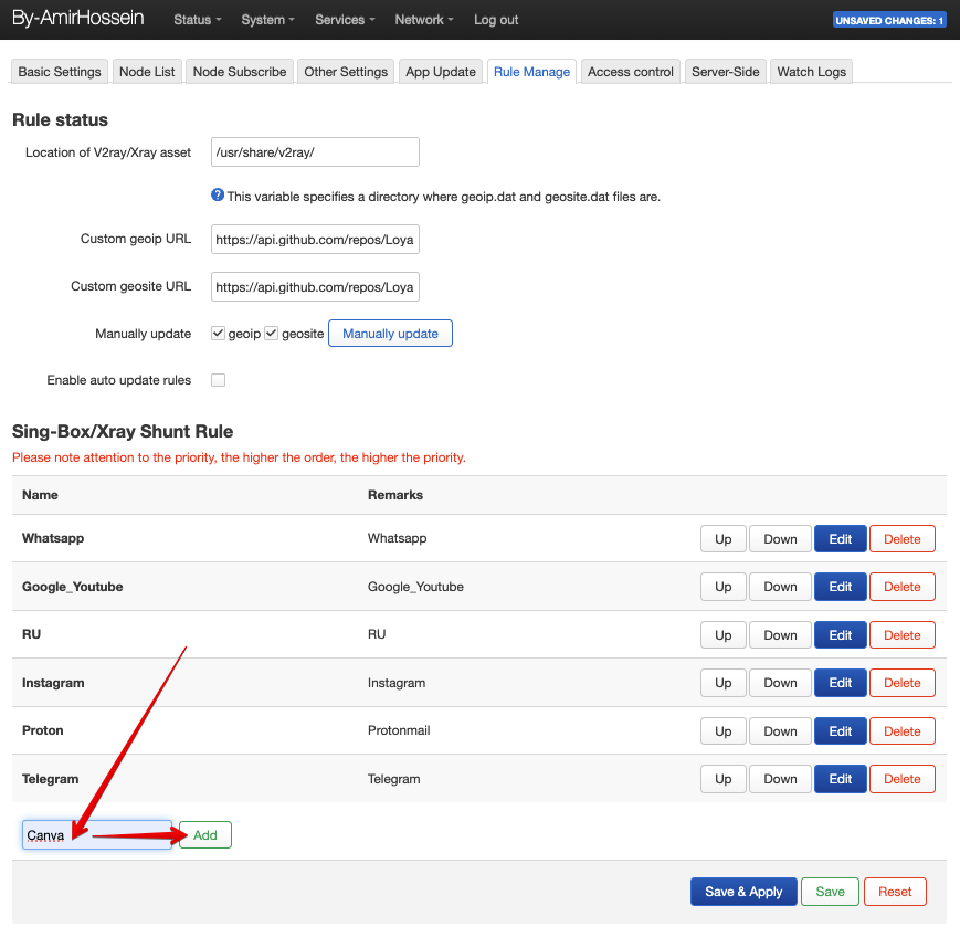 В низу блока “Sing-Box/Xray Shunt Rule” вводим название для нашего правила и нажимаем кнопку “Add”