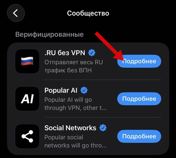Откроется список пресетов. В блоке Верифицированные выбрать подходящий пресет (например, .RU без VPN — отправляет весь российский трафик напрямую, минуя ВПН)